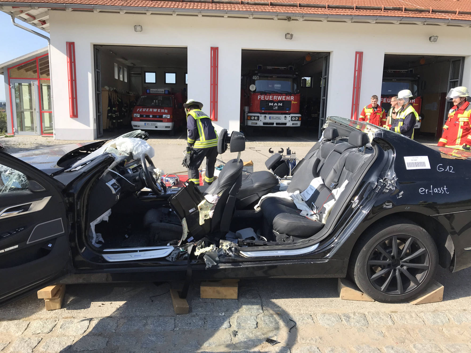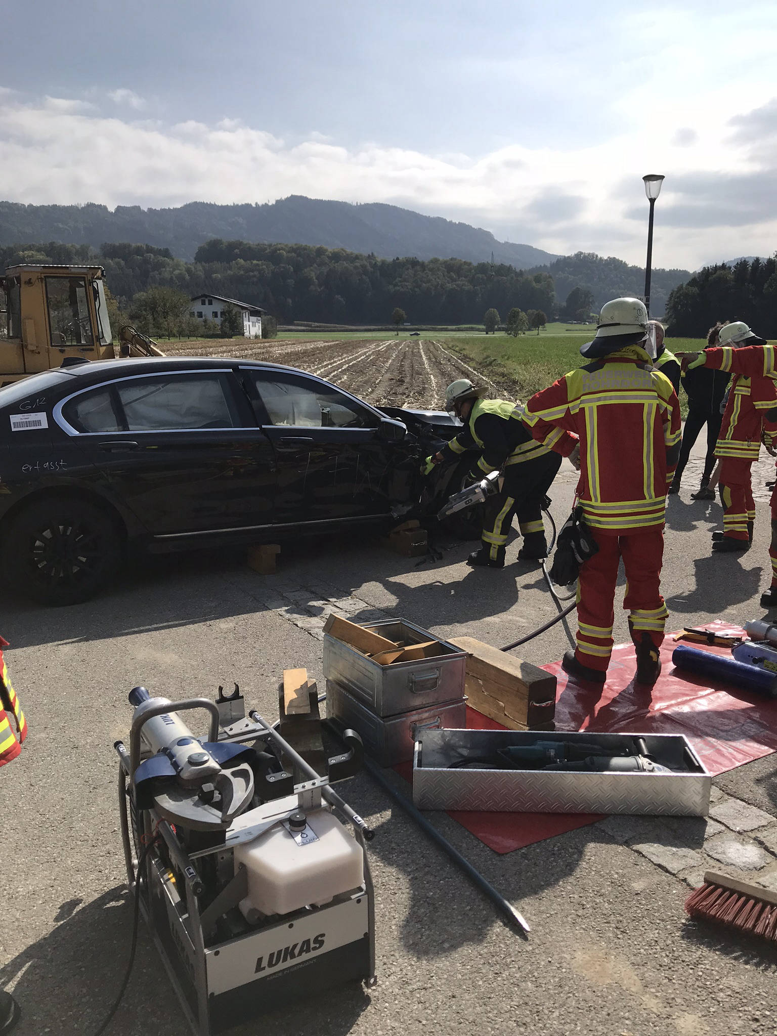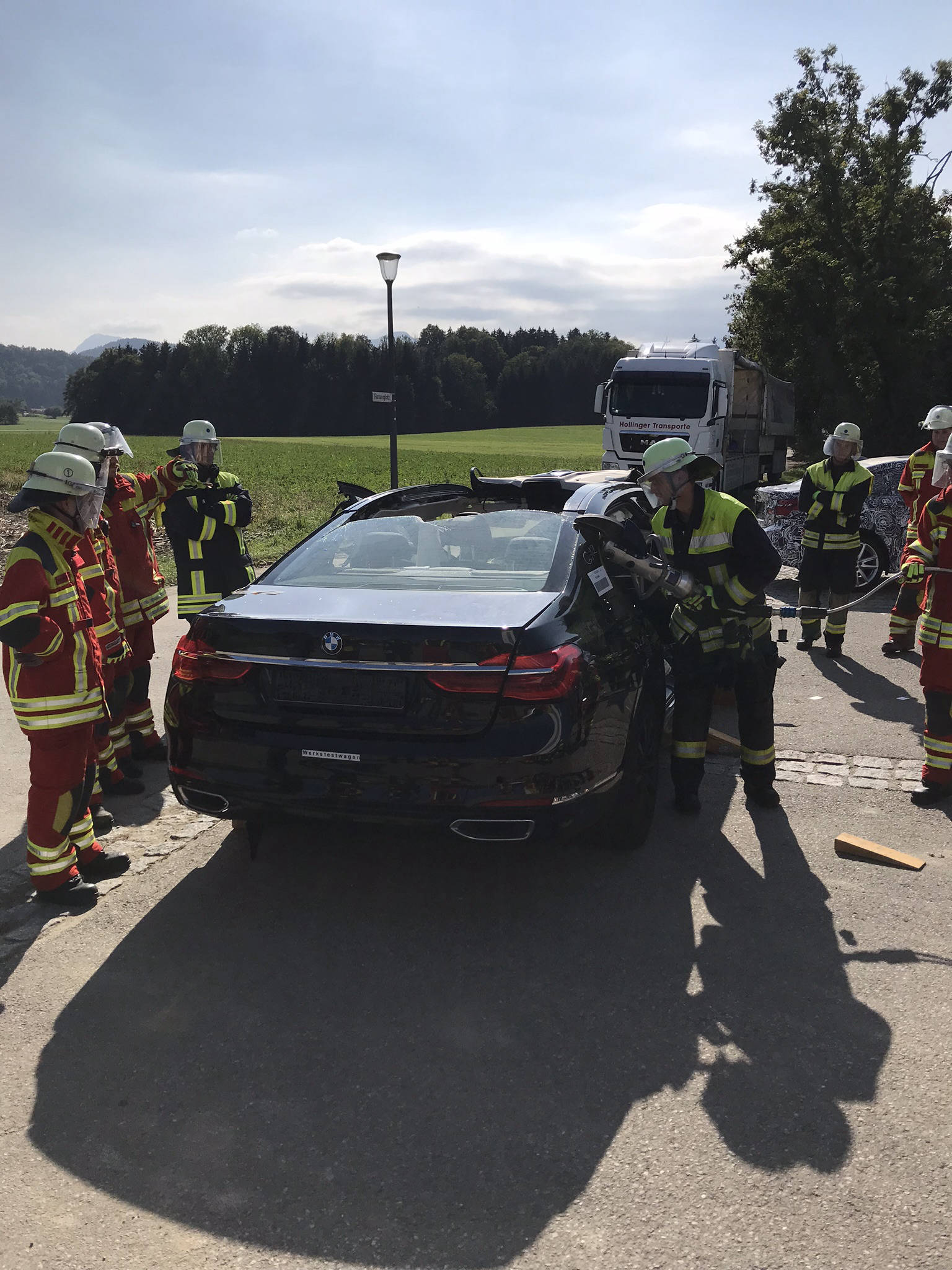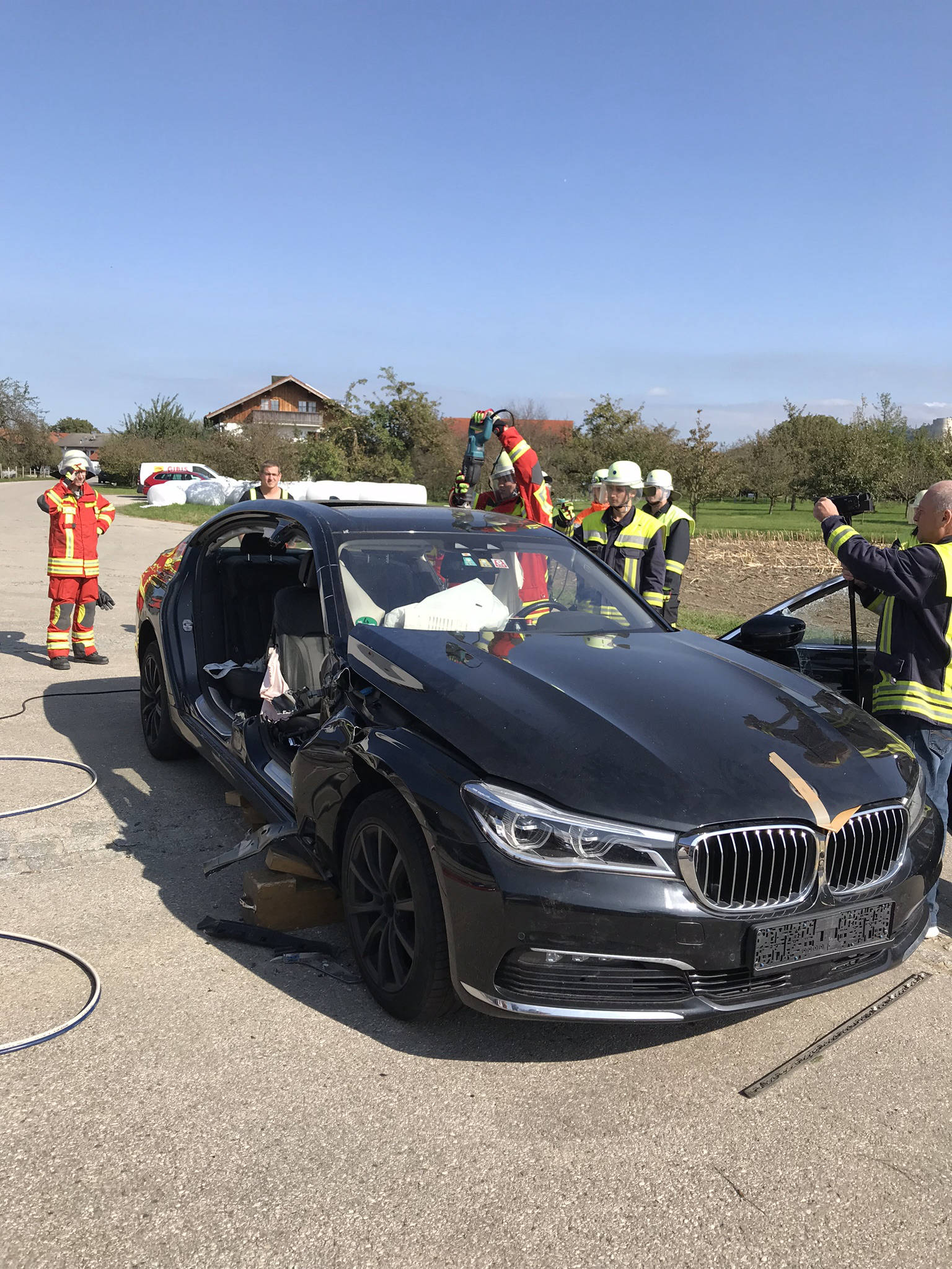 Übung Spreitzer und Schere an Testwägen von BMW. Dank BMW konnten wir unseren hydraulischen Rettungssatz auch einmal an hochmodernen Autos testen. Der Vorteil hierbei lag daran, dass man in ruhe verschiedene Rettungsmethoden an modernen Autos ausprobieren konnte und somit sieht, wie unterschiedlich sich die neuen Fahrzeuge in vergleich zu alten PKW's verhalten. Hierbei wurde festgestellt, dass selbst unsere Geräte, welche sich auf den aktuellsten Stand befinden, an manchen stellen an ihre Grenzen stoßen.