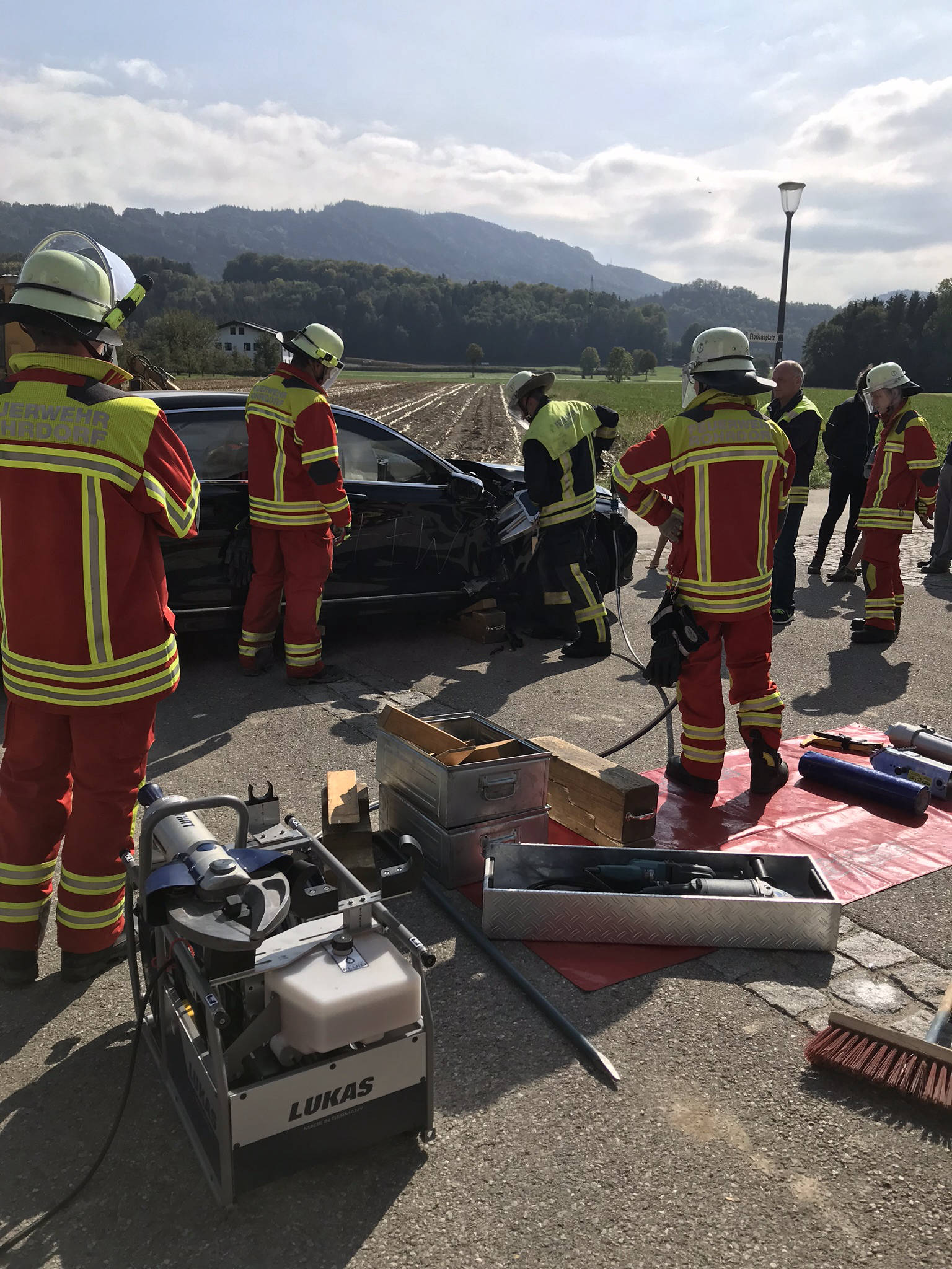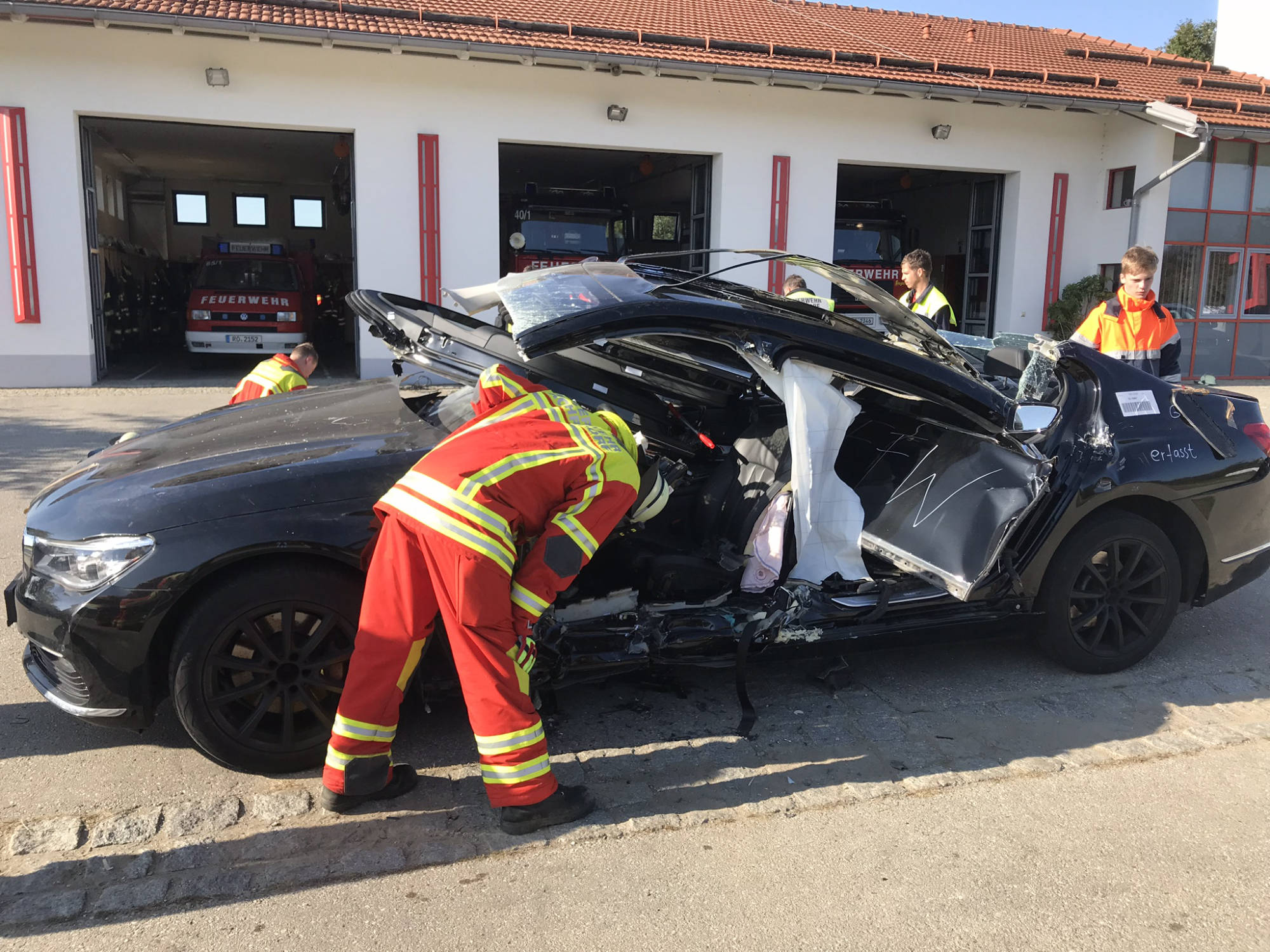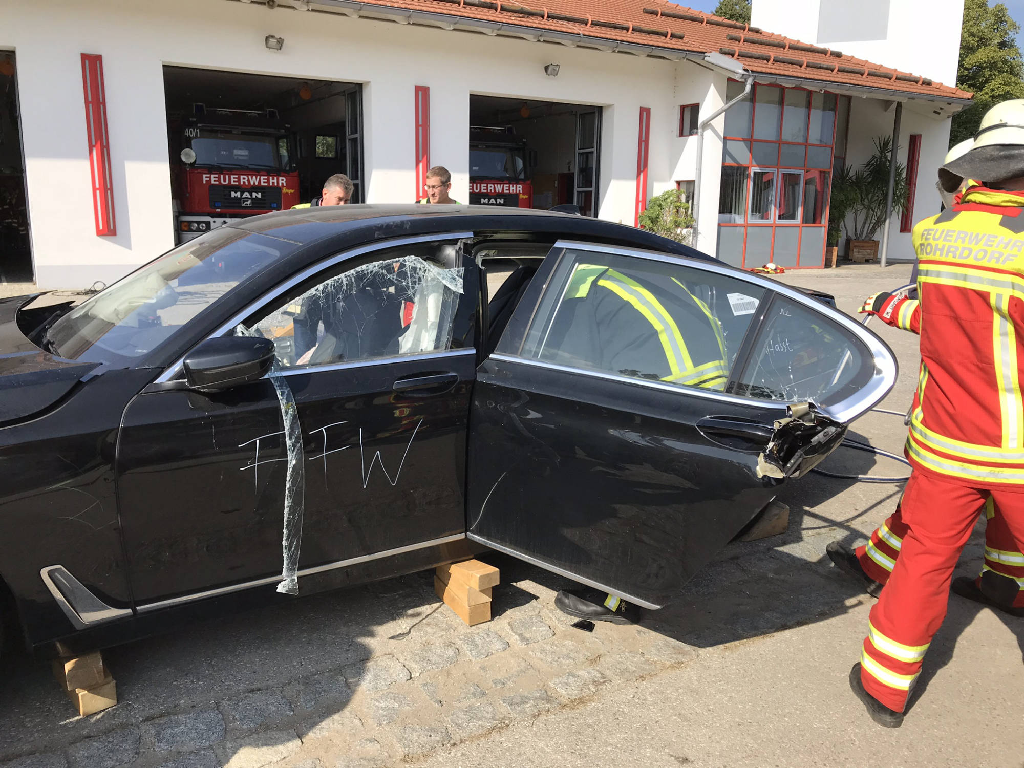 Übung Spreitzer und Schere an Testwägen von BMW. Dank BMW konnten wir unseren hydraulischen Rettungssatz auch einmal an hochmodernen Autos testen. Der Vorteil hierbei lag daran, dass man in ruhe verschiedene Rettungsmethoden an modernen Autos ausprobieren konnte und somit sieht, wie unterschiedlich sich die neuen Fahrzeuge in vergleich zu alten PKW's verhalten. Hierbei wurde festgestellt, dass selbst unsere Geräte, welche sich auf den aktuellsten Stand befinden, an manchen stellen an ihre Grenzen stoßen.