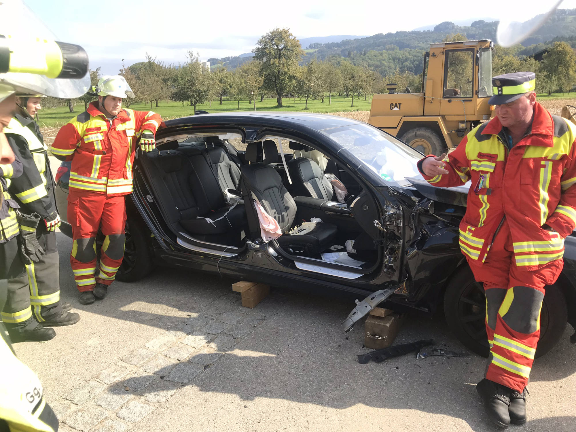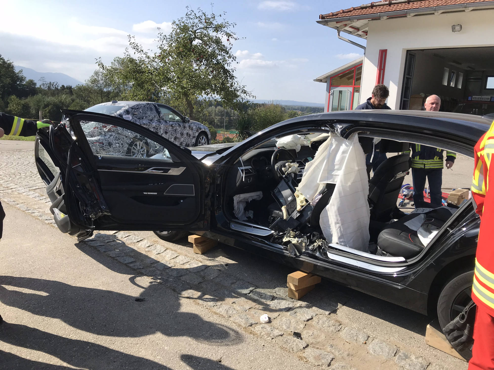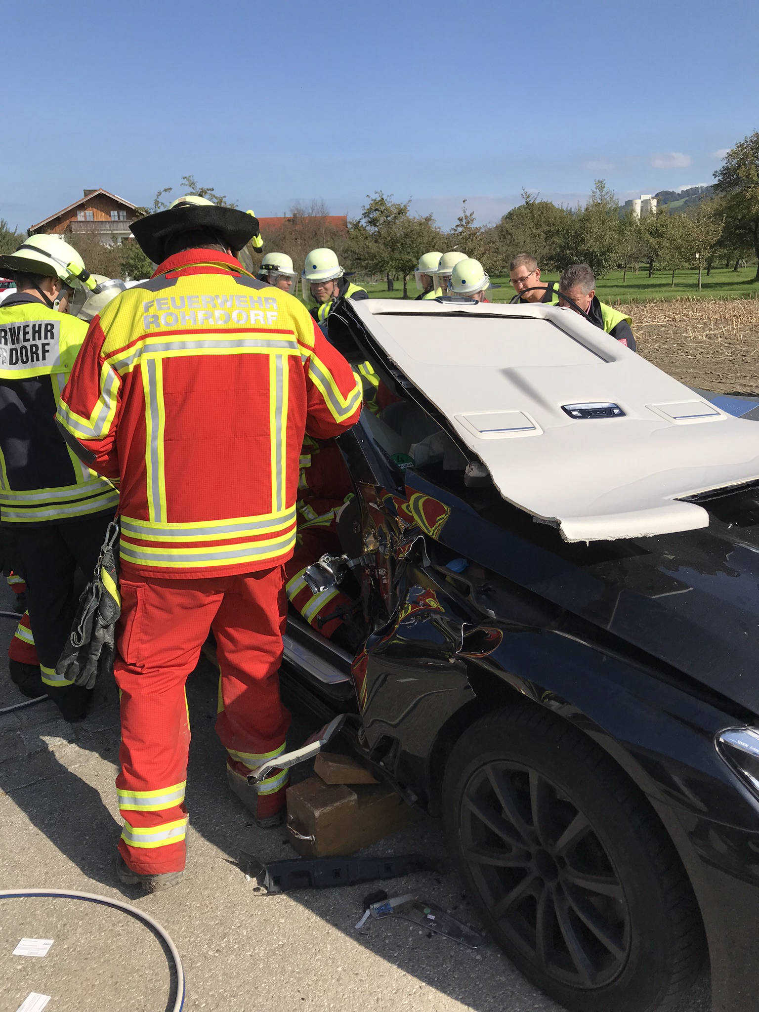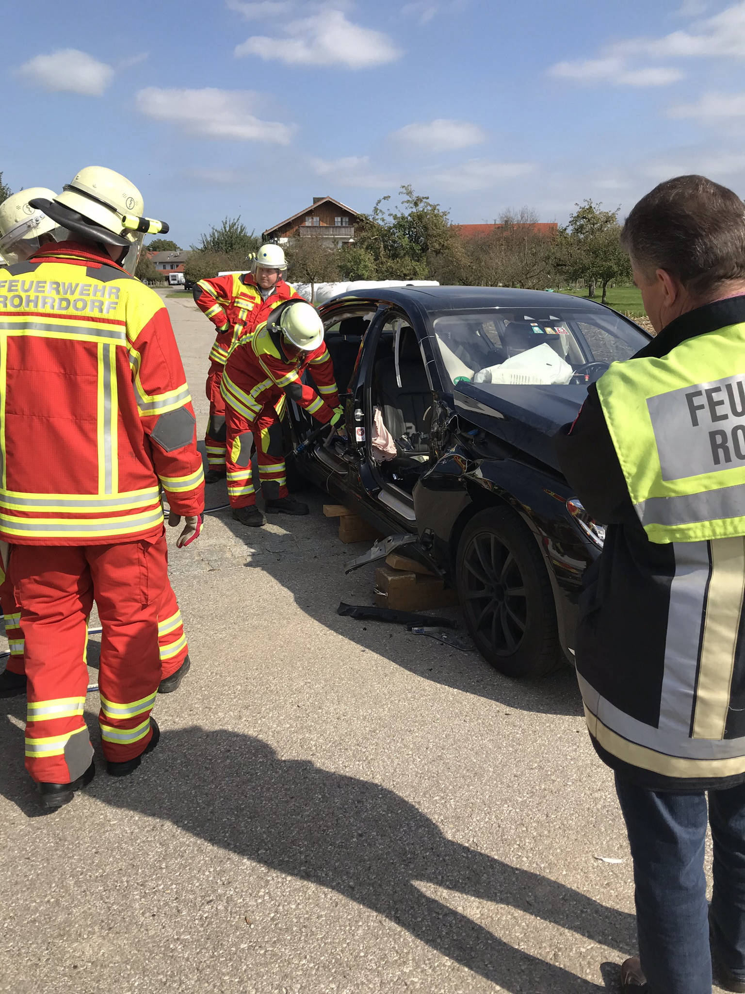 Übung Spreitzer und Schere an Testwägen von BMW. Dank BMW konnten wir unseren hydraulischen Rettungssatz auch einmal an hochmodernen Autos testen. Der Vorteil hierbei lag daran, dass man in ruhe verschiedene Rettungsmethoden an modernen Autos ausprobieren konnte und somit sieht, wie unterschiedlich sich die neuen Fahrzeuge in vergleich zu alten PKW's verhalten. Hierbei wurde festgestellt, dass selbst unsere Geräte, welche sich auf den aktuellsten Stand befinden, an manchen stellen an ihre Grenzen stoßen.