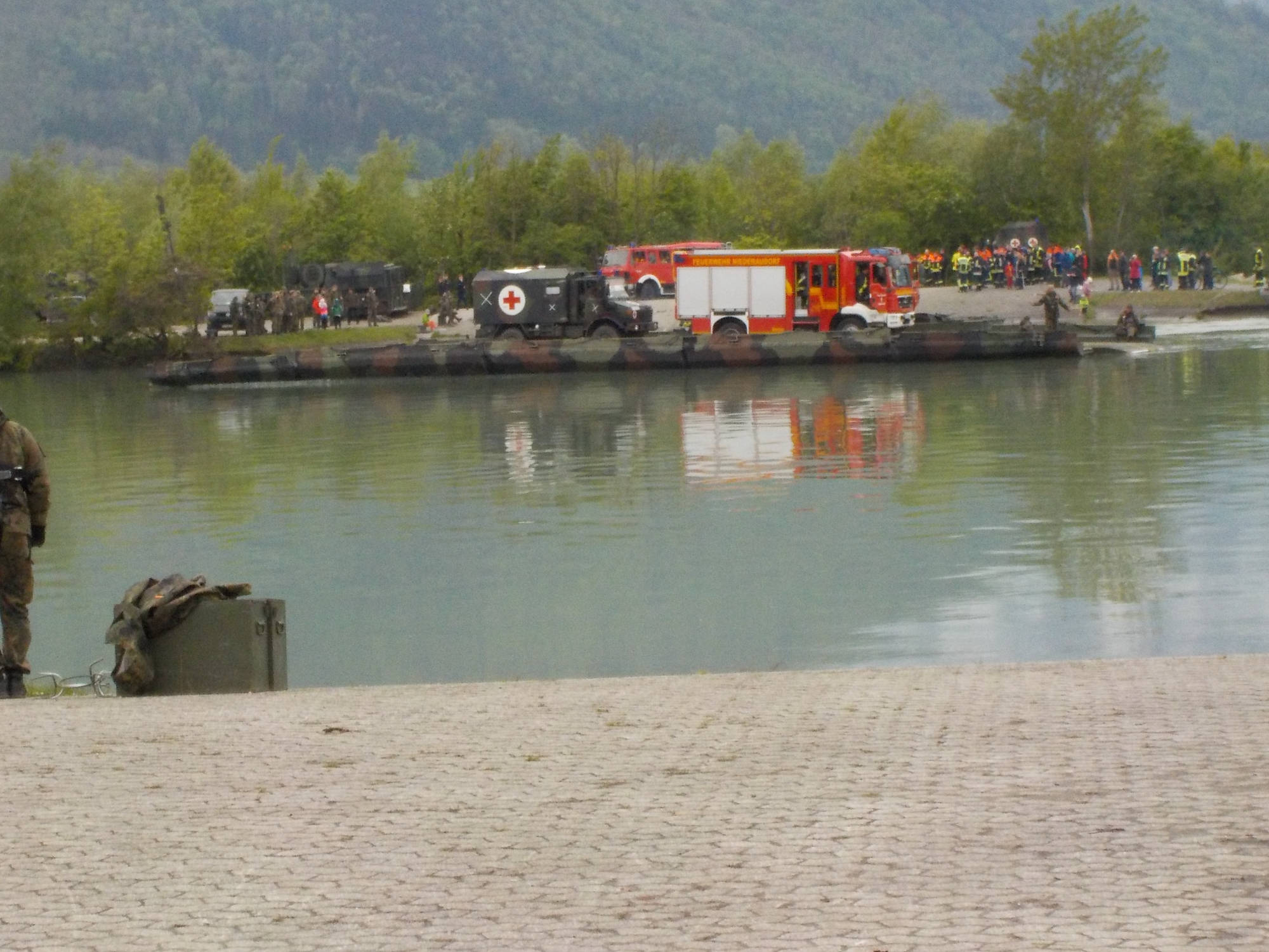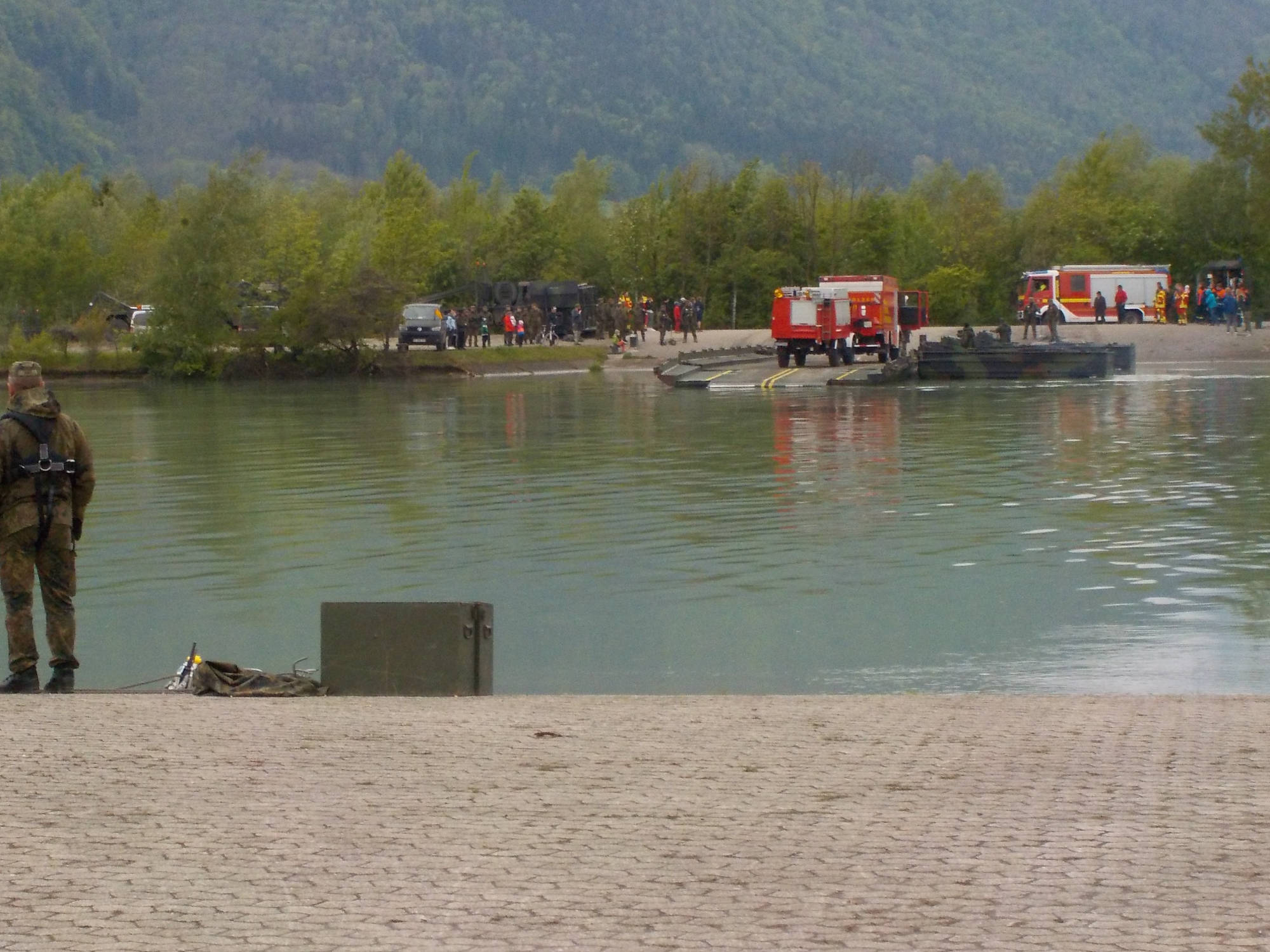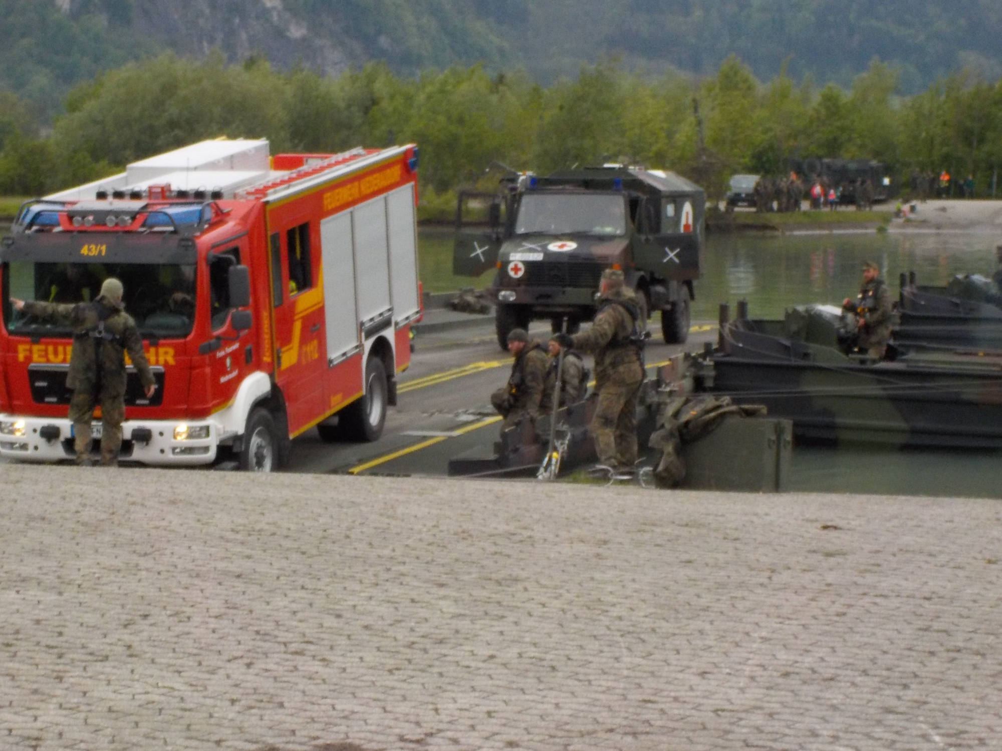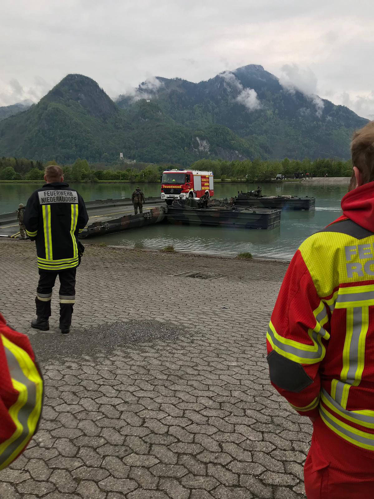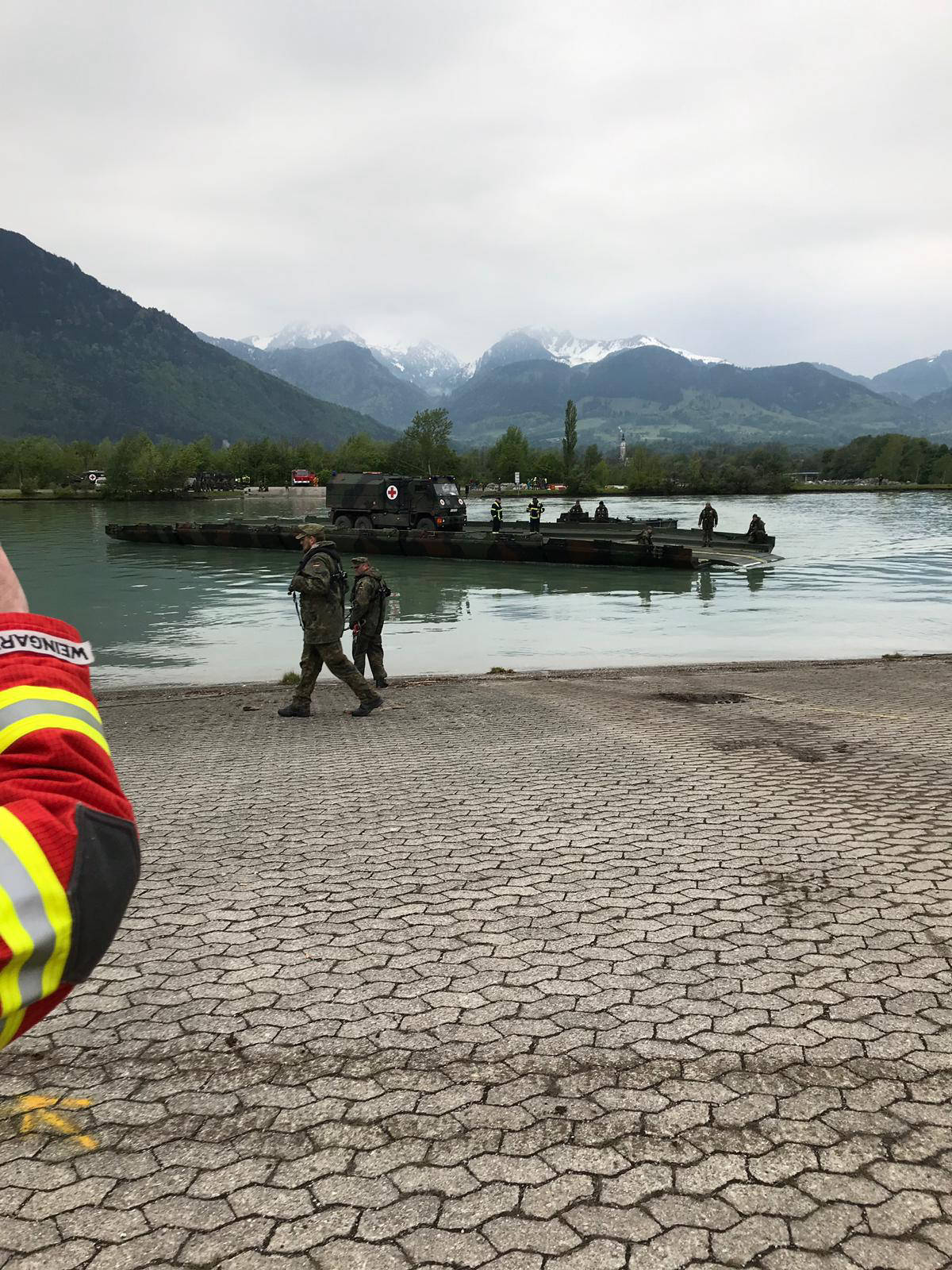 Zurzeit findet in der Region die Übung "Berglöwe" der Bundeswehr mit 1500 Soldaten und 250 Fahrzeugen statt. In Ramen der Übung wurde auch die Überquerung des Inn mit einem Floß geübt. Am gestrigen Mittwoch fuhren wir mit einer kleinen Delegation unserer Feuerwehr nach Brannenburg zum ehemaligen Übungsgelände der Bundeswehr, um dort mithilfe des Floßes über den Inn gebracht zu werden. Vor Ort angekommen merkte man schnell das große interesse der Bevölkerung und die rege Teilnahme anderer Hilfsorganisationen, welche gespannt den Soldatinnen und Soldaten bei ihrer Arbeit zuschauten. Nachdem wir uns das Spektakel angesehen haben und über den Inn gefahren wurden, kehrten wir wieder zum Gerätehaus zurück. Ein durchaus lehrreicher und vor allem Interessanter Ausflug, welcher auch die tolle Arbeit der Bundeswehr veranschaulichte.