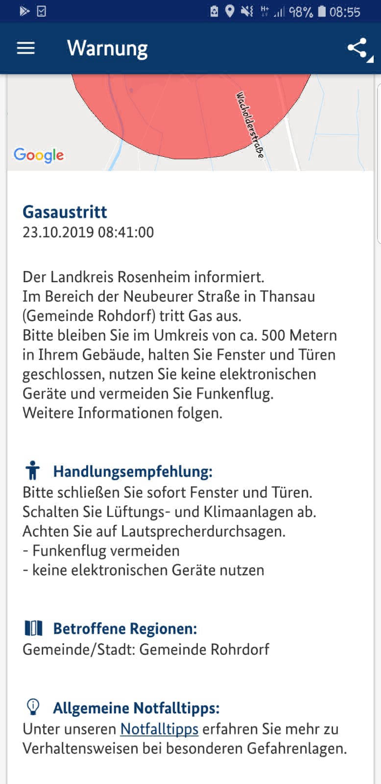 Dort wurde bei der Prüfung eines unterirdischen Gas Tanks austretendes Gas festgestellt. Wir stellten gemeinsam mit den anderen Feuerwehren den Brandschutz sicher und sperrten den Bereich weiträumig ab. Zudem war es notwendig, einige Häuser zu evakuieren und zu kontrollieren.