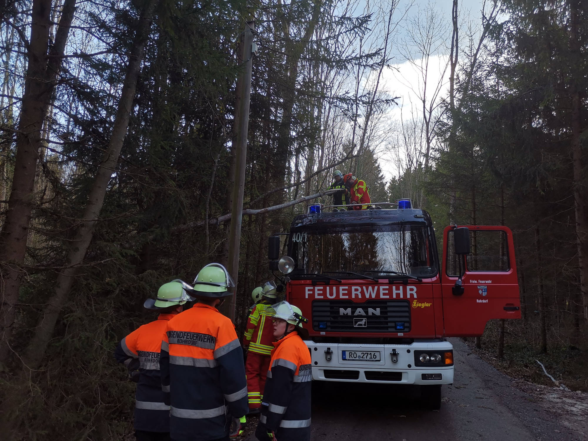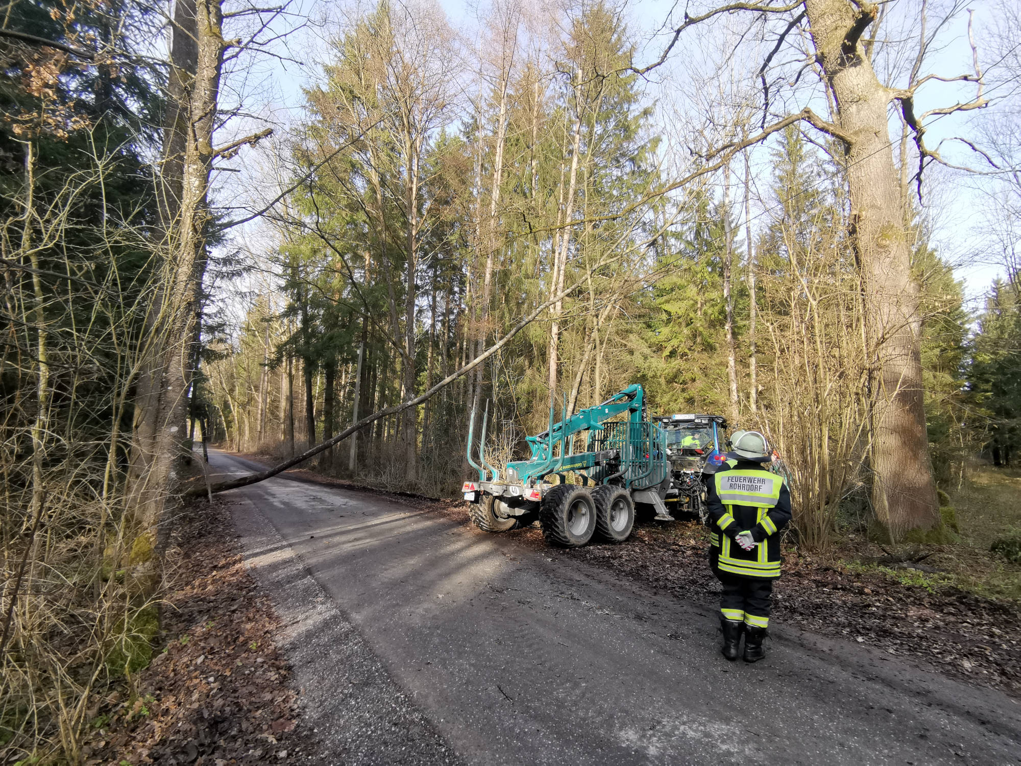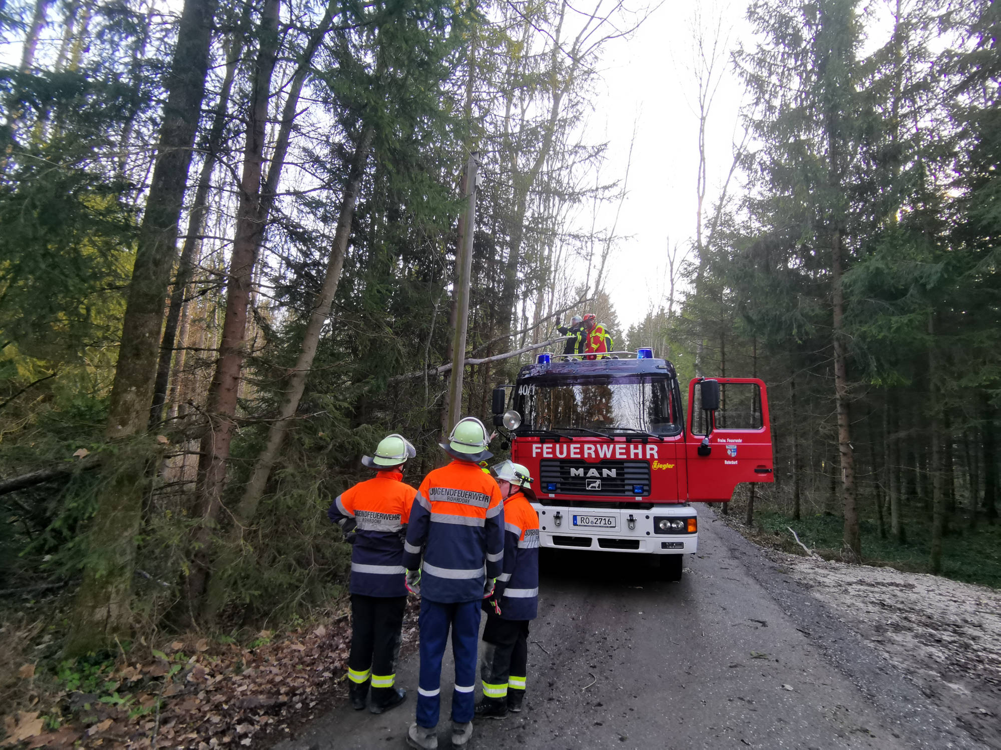 Wir entfernten die auf der Straße liegenden Bäume und konnten mit einem hinzugerufenen Forstbetrieb auch den in der Telefonleitung hängenden Baum entfernen.