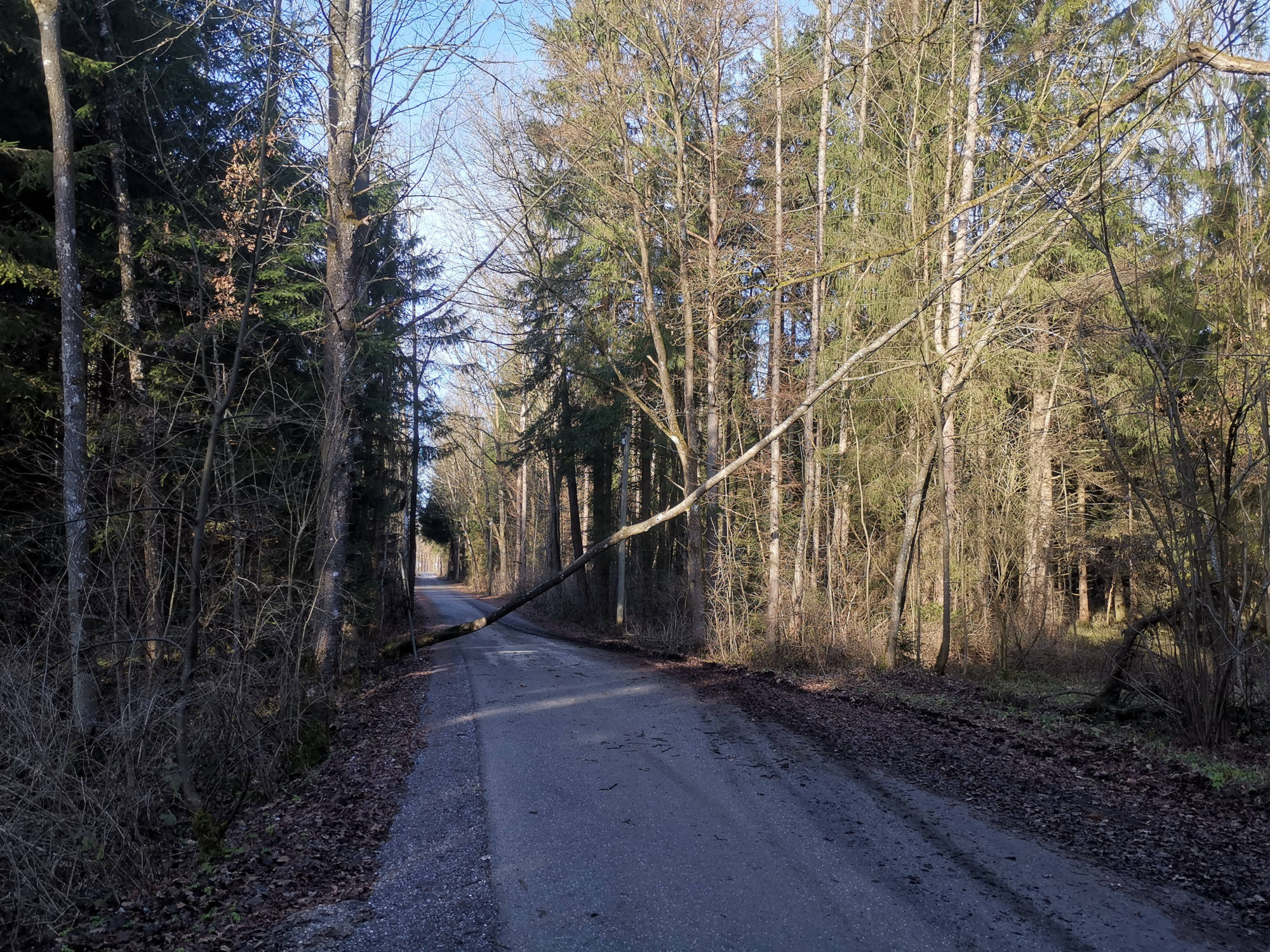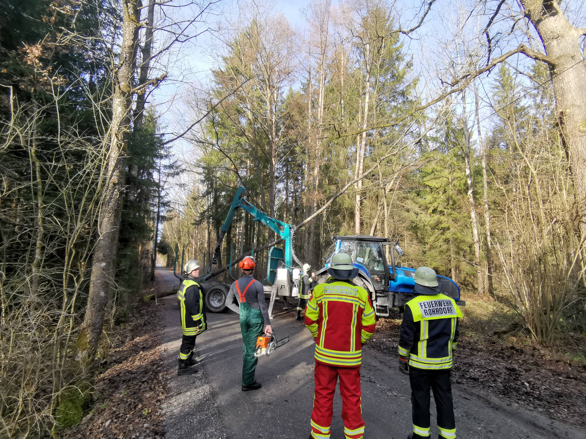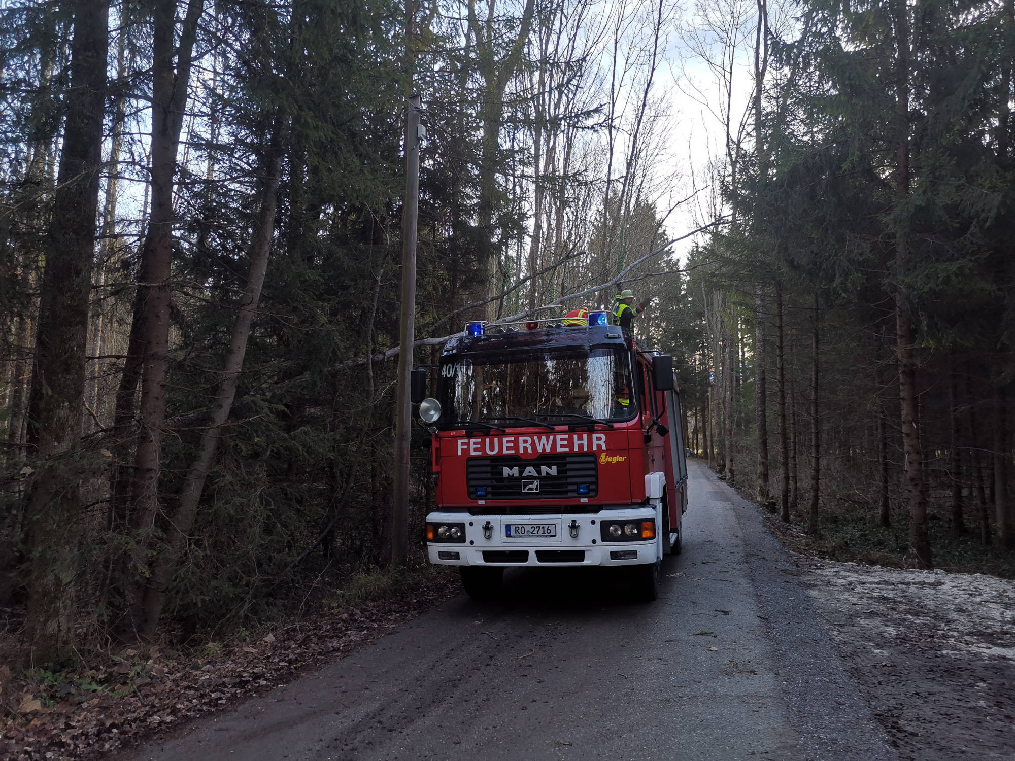 Wir entfernten die auf der Straße liegenden Bäume und konnten mit einem hinzugerufenen Forstbetrieb auch den in der Telefonleitung hängenden Baum entfernen.