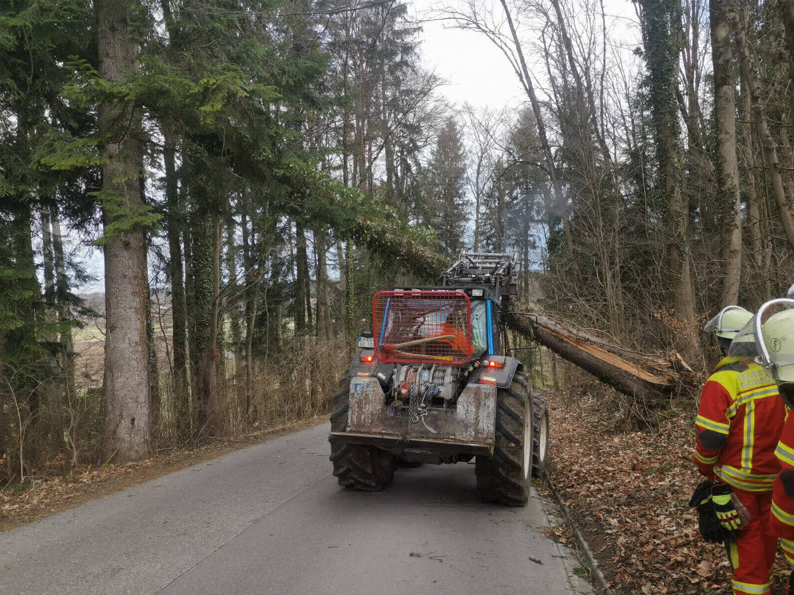 Mit einem hinzugerufenen Forstbetrieb konnte der Baum mittels Seilwinde sicher entfernt und die Straße wieder freigegeben werden.
